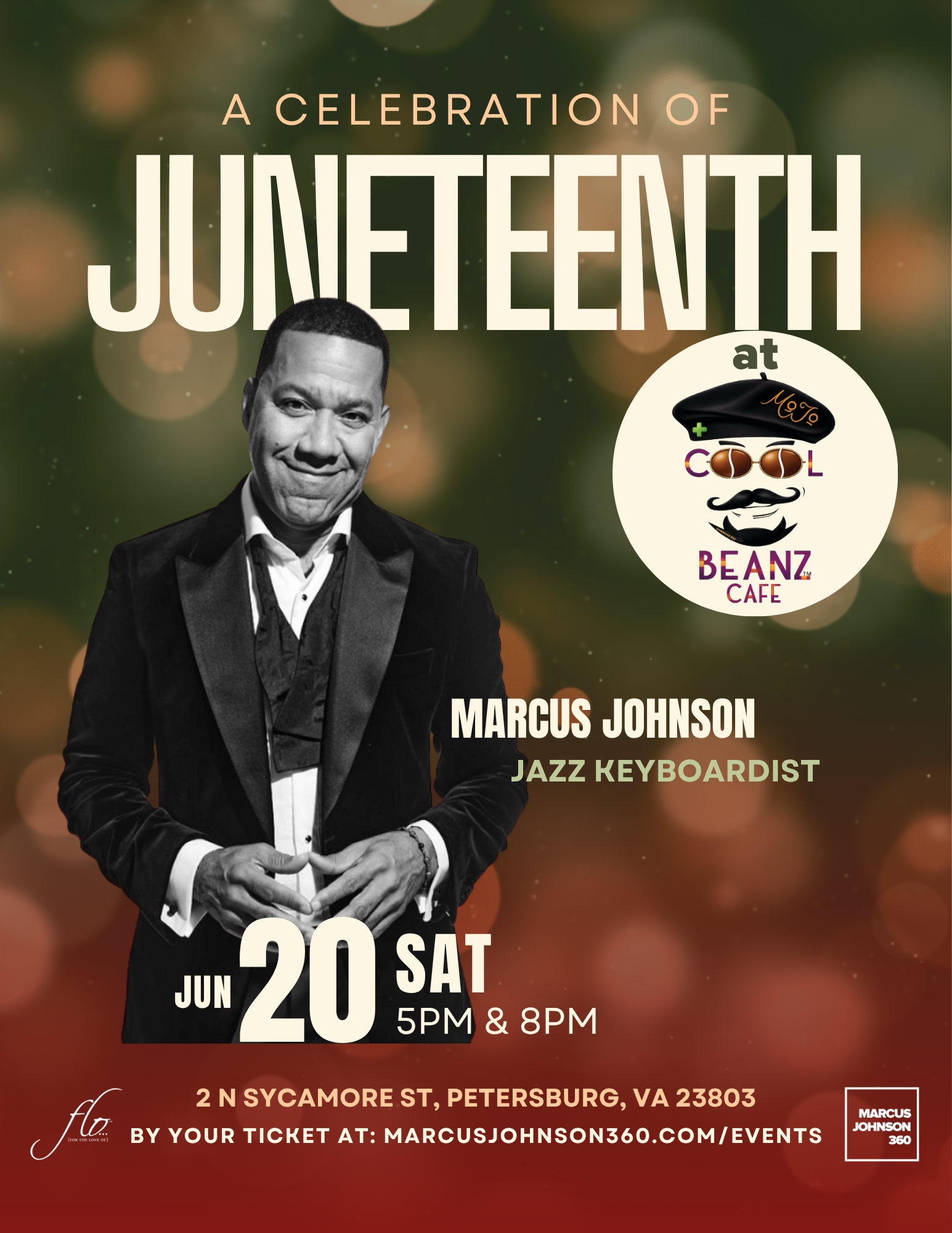 Celebrate Juneteenth with an unforgettable evening of live jazz, culture, and connection as Billboard chart-topping pianist Marcus Johnson brings his signature FLO (For the Love Of) experience to Cool BeanZ Café in Petersburg, VA.